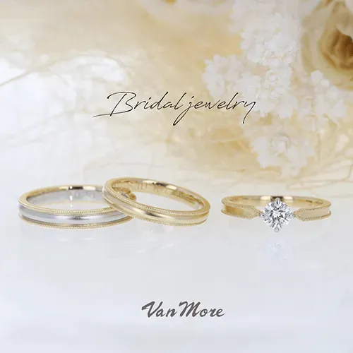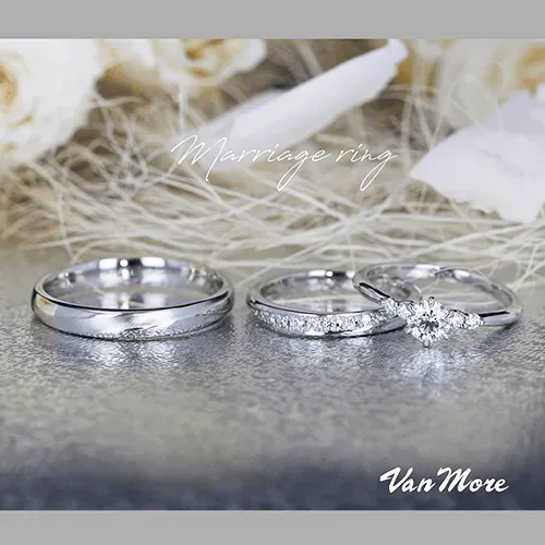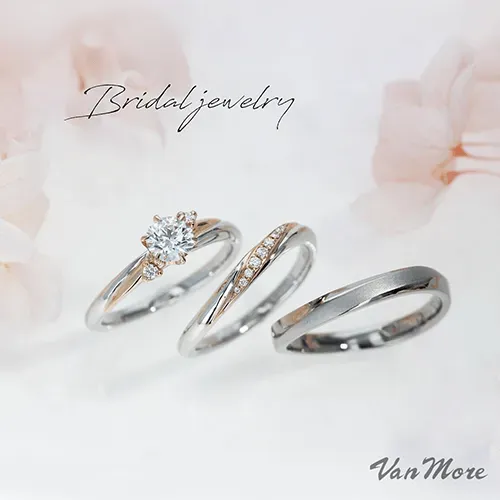 セットリング(ご婚約指輪と結婚指輪)の価格はデザインやダイヤモンドの大きさ、素材によって異なりますが、一般的には50万円台〜60万円台が目安です。