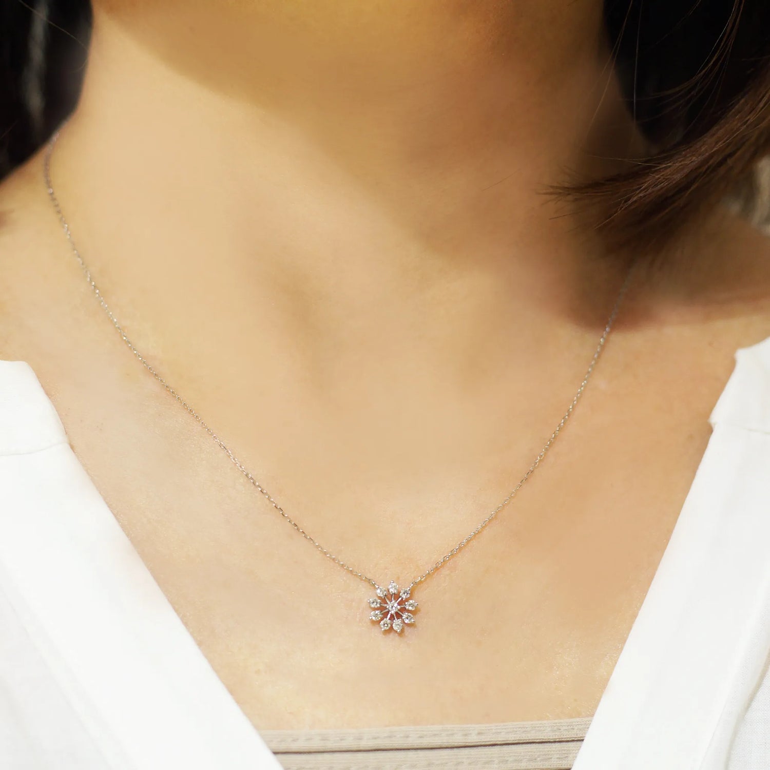 「柔らかに舞う雪のきらめきを胸もとに。」 10粒のダイヤモンドを円のように配して生まれた、可憐で上品なプラチナペンダント。 ふんわりとした光の輪が、冬の結晶のように優しく輝きます。 シンプルな中に、女性らしさと可愛らしさを秘めたデザインです。