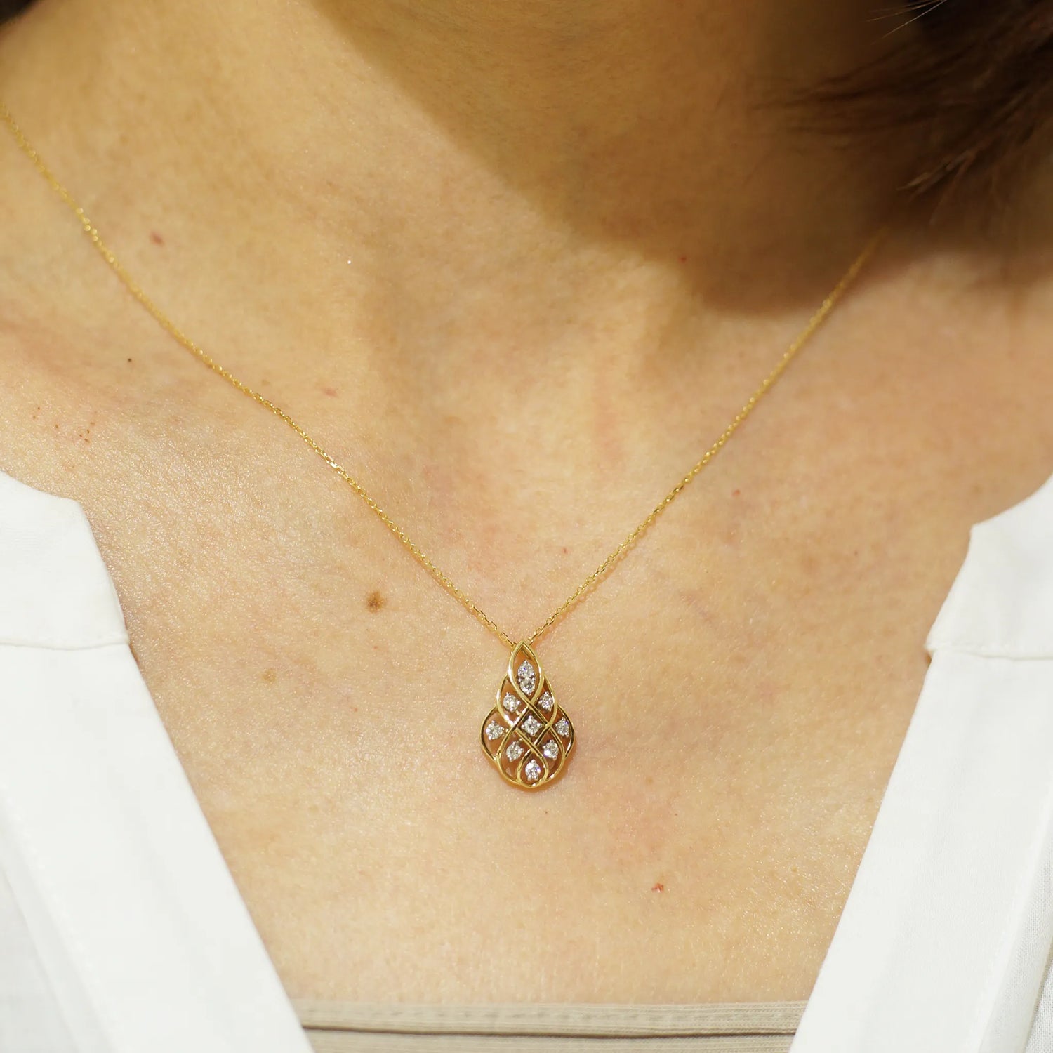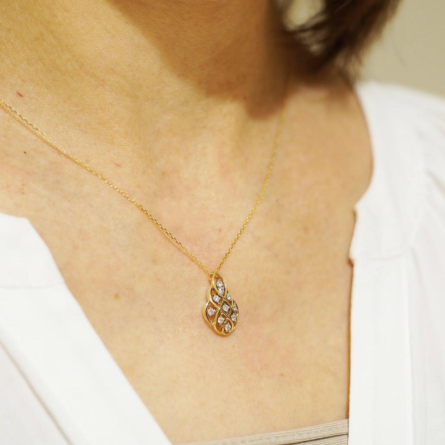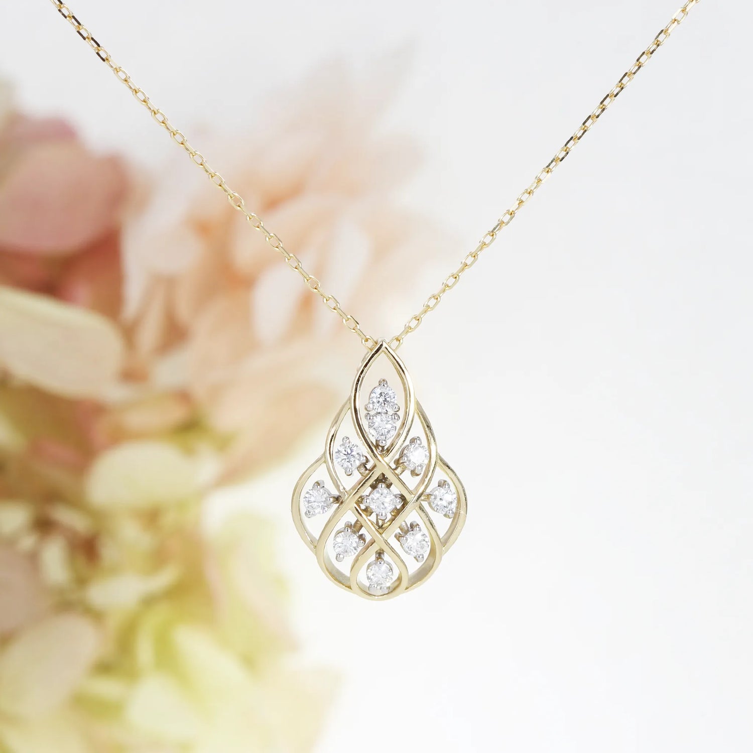 「編まれた光、透ける空間に宿る上質な抜け感。」 K18のあたたかなゴールドラインに、10粒のダイヤモンドを縫うように配置。 ダイヤモンドの枠をプラチナにすることで、透明感のある白い輝きを引き立てました。 肌に透ける空間が軽やかで、上質な遊び心を感じさせるデザインです。