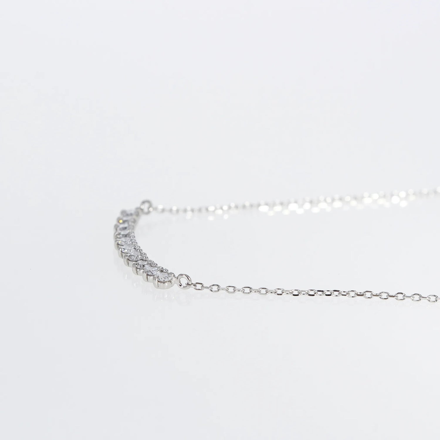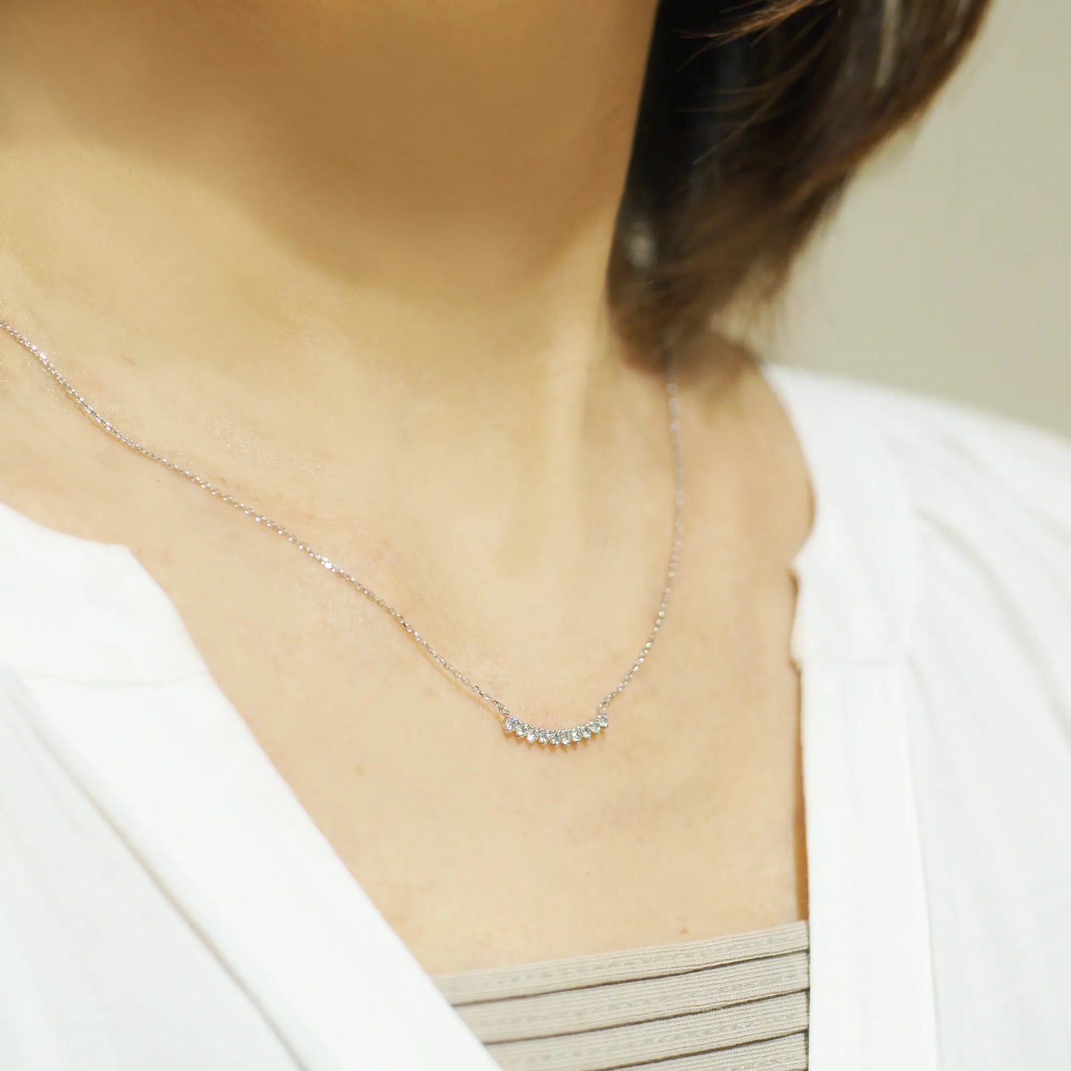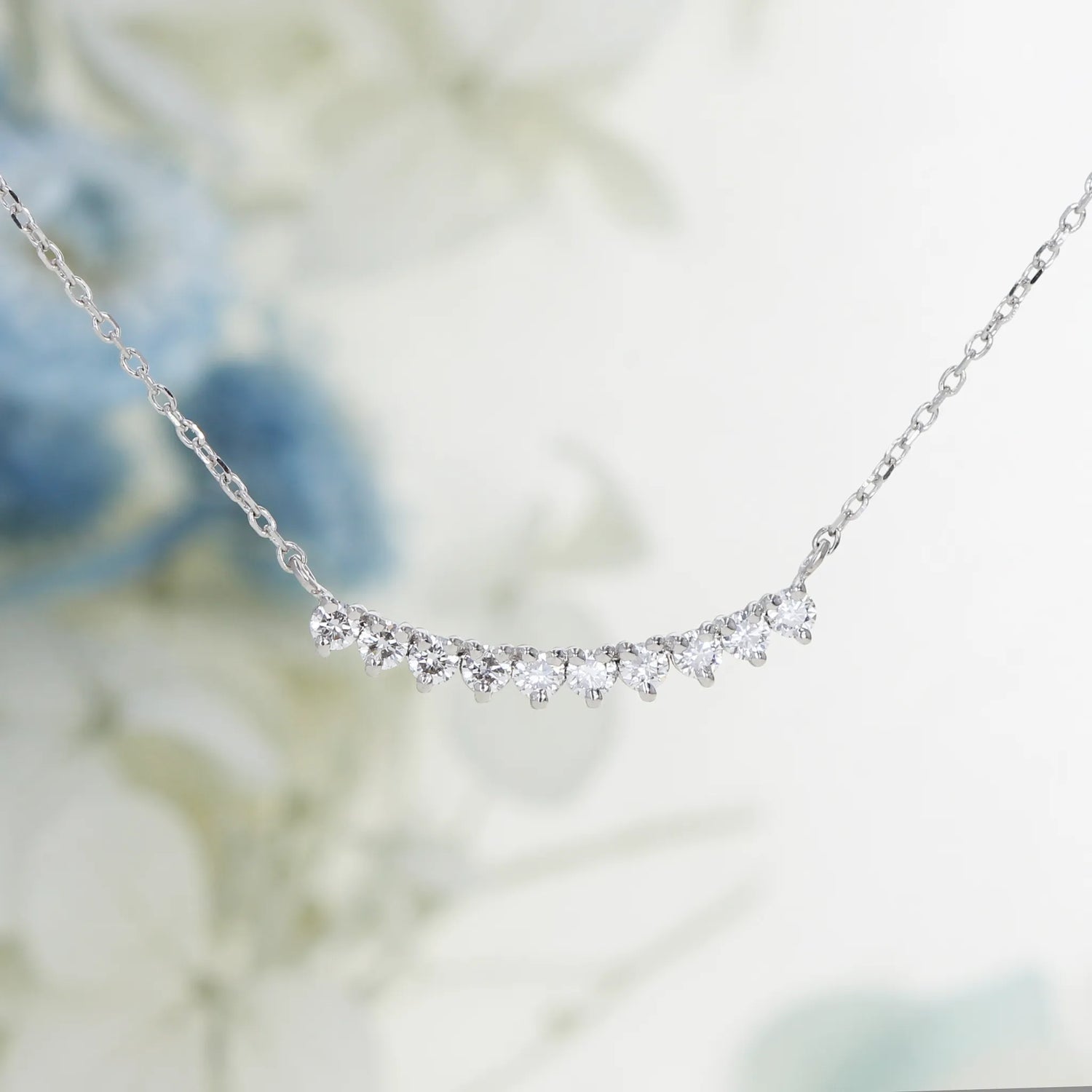 「鎖骨のラインに光を描く、シンプルエレガンス。」 10粒のメレダイヤモンドを繊細に横へと並べた、気品あるデザイン。 プラチナの上質な白い輝きが肌になじみ、まるで光そのものをまとっているよう。 どんなスタイルにも寄り添う、日常を上品に輝かせる一本です。